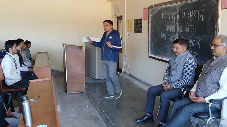 राजकीय महाविद्यालय धर्मशाला में पंचनद शोध संस्थान, अध्ययन केंद्र कांगड़ा द्वारा “भारतीय परंपरा में योग का महत्व विषय पर एक प्रेरणादायी गोष्ठी का आयोजन किया गया। कार्यक्रम में मुख्य प्रस्तोता के रूप में हिमाचल प्रदेश केंद्रीय विश्वविद्यालय के योग अध्ययन केंद्र के सहायक आचार्य डॉ. विकास नड्डा ने योग के विभिन्न आयामों पर विस्तारपूर्वक चर्चा की।
