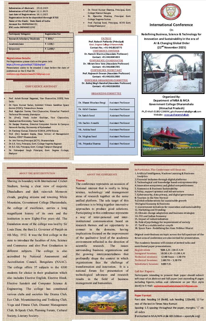 राजकीय महाविद्यालय धर्मशाला के एमबीए एवं एमसीए विभाग की ओर से 22 नवम्बर और 23 नवम्बर 2025 को एक अंतर्राष्ट्रीय संगोष्ठी (International Conference) का आयोजन किया जा रहा है। इस संगोष्ठी का विषय है Redefining Business, Science & Technology for Innovation and Sustainability in the Era of AI & Changing Global Order.