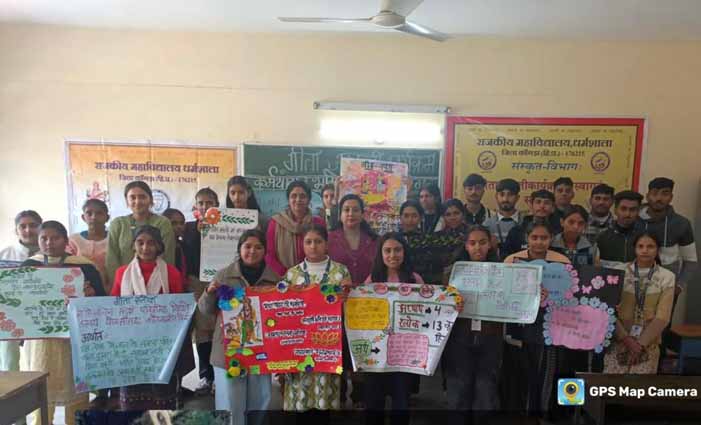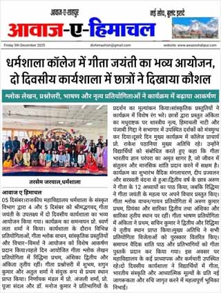 राजकीय महाविद्यालय धर्मशाला के संस्कृत विभाग द्वारा 4 और 5 दिसंबर 2025 को श्रीमद्भगवद् गीता जयन्ती के अवसर पर द्विदिवसीय कार्यशाला का भव्य आयोजन किया गया, जिसका समन्वयन प्रो. स्वर्ण लता शर्मा ने किया। पहले दिन गीता श्लोक लेखन प्रतियोगिता में रिद्धिमा ने प्रथम, अंशिका द्वितीय और अंकिता तृतीय स्थान प्राप्त किया, जबकि गीता प्रश्नोत्तरी में शुभम, शगुन कुमार और अतुल शर्मा प्रथम स्थान पर रहे। निर्णायक मंडल में प्रो. अंजली शर्मा (हिंदी विभाग), प्रो. पूजा संदल (अंग्रेजी विभाग) और डॉ. मनोज कुमार (संस्कृत विभाग, राजकीय अध्यापक शिक्षा महाविद्यालय धर्मशाला) ने प्रतियोगिताओं में न्यायपूर्ण मूल्यांकन और मार्गदर्शन की भूमिका निभाई।