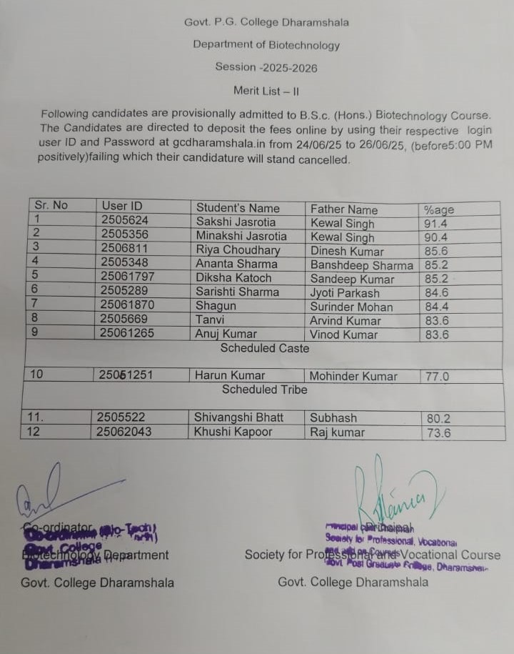 Dated: 24/06/2025 B.Sc., B.Com., & BA First Year (2025-26) Merit-II Following students are provisionally admitted subject to the verification of original documents. His/Her candidature will be cancelled if any discrepancy found in future. Deposit the fee online on the link given at www.gcdharamshala.in upto 27/06/2025 (before 05:00 PM Positively) Physics Chemistry Botany MathemRead More…